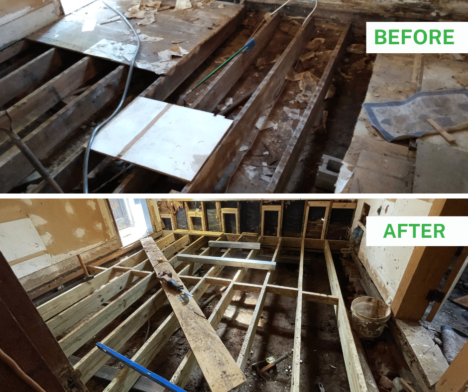This was a three-day job. We completed the first 9 Smart Jack within the crawlspace around the home to build stability. We then rebuilt the whole kitchen floor joist.