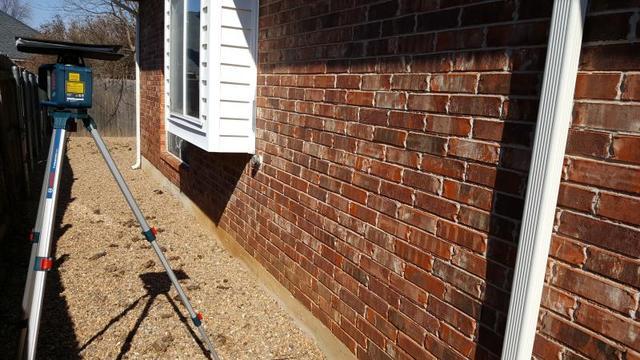Identifying where your foundation moves and where it is stable takes more than just an ‘eyeball’ approach to diagnosing. Below you will see a laser transit used to help determine where the foundation is moving. Using tape and pulling measurements off of the foundations mortar joints will help you understand where the foundation wall is cracked and where steel piers can be installed.
